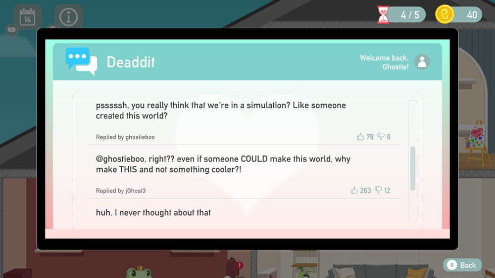 Nichtsdestotrotz gestaltet sich mein Nachleben sehr zauberhaft: Ich beschenke die liebenswerten Charaktere, schaue wie sie zusammenpassen und entdecke die zahlreichen verschiedenen Geschichten. Hast du übrigens alle verfügbaren Figuren miteinander verkuppelt, endet deine erste Runde und du kannst mit New Game+ nochmal sterben und von vorn beginnen. Vorherige Informationen über die Figuren und bereits freigeschaltete Beziehungsenden bleiben dabei bestehen. Zusätzlich gibt es auch noch Deaddit zum Lesen und einige Minispiele, die das Ganze unterhaltsam machen. Das motiviert mich persönlich alles sehr, wirklich noch mehrere Durchgänge zu starten und mir die einzelnen Geschichten der Charaktere anzuschauen. Apropos, Motivation.