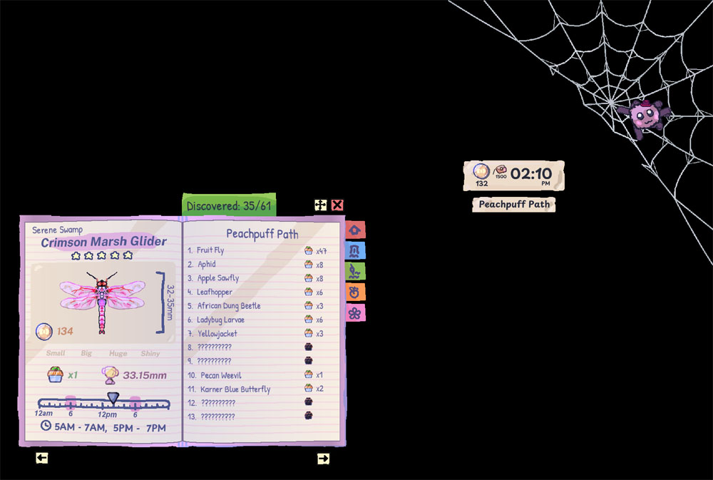 Im Spiel kannst du mehrere Orte besuchen, die unterschiedliche Insekten zum Fangen anbieten. Einige tauchen dabei zu unterschiedlichen Uhrzeiten auf. Glücklicherweise hat das entwickelnde Team darauf geachtet, dass die Zeit im Spiel anders verläuft als in der Realität – sonst würde ich wahrscheinlich immer noch nur drei Käfer haben. Die Zeit im Spiel vergeht deutlich schneller als hier draußen, sodass ich tagsüber im Grunde auch Insekten fangen kann, die eigentlich nachtaktiv sind.