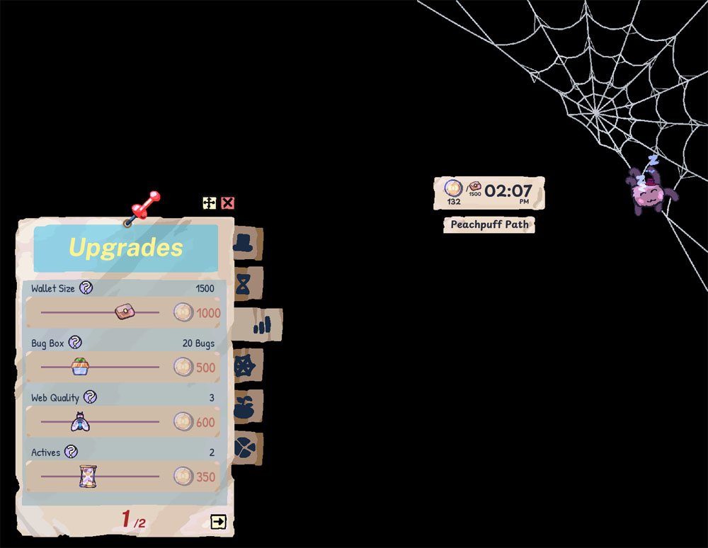 Ähnlich wie auch schon Ropuka’s Idle Island sitzt meine kleine Spinne einfach in der Ecke meines Bildschirms und ist dabei nicht aufdringlich. Da sie zudem nur im Netz hin und her klettert oder mal schläft, bietet sie tatsächlich auch nicht so viele Ablenkungsmöglichkeiten, sondern chillt einfach nur da rum. Das finde ich sehr entspannend. Das einzige, worauf ich nur immer mal einen Blick haben muss, ist meine Bug Box, in der meine gefangenen Insekten liegen. Die ist am Anfang relativ klein und wird somit relativ schnell voll. Doch das ist für mich der einzige stressige Moment im Spiel selbst.